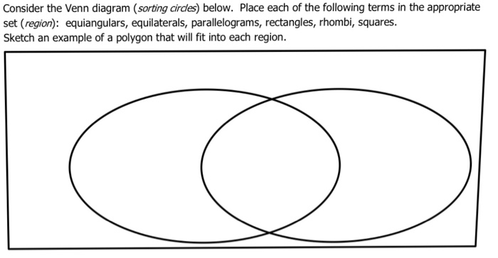Polygon Bucket and Venn Diagram Practice eTool (Desmos) Click on the link below to access eTool. Polygon Bucket (Desmos) Use this eTool to learn more about different Polygons and Venn Diagram. Move a shape to the appropriate section on the Venn Diagram. Venn diagrams can be used to solve certain types of logic puzzles. Introduce 2D figures and polygons with this complete interactive notebook set which uses Venn diagrams and attributes of figures to define the sets and subsets of the classification system. Included in the interactive notebook set are: foldable notes, three practice activities and a five question t • Venn diagram a diagram that uses overlapping ovals (or other shapes) to show how sets of numbers or objects are related. Lesson Objectives Content Objectives • Classify two-dimensional figures in a Venn diagram or tree diagram based on properties of the figures. • Draw and use Venn diagrams and tree diagrams to show the relationships among Exhibit your knowledge of 2D shapes and search for similar characteristics. This interactive diagram focuses on sorting polygons by common properties and then you select the correct label for each section of the Venn Diagram. This resource is part of the Math at the Core: Middle School collection.