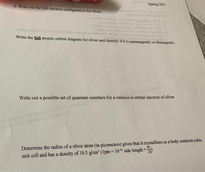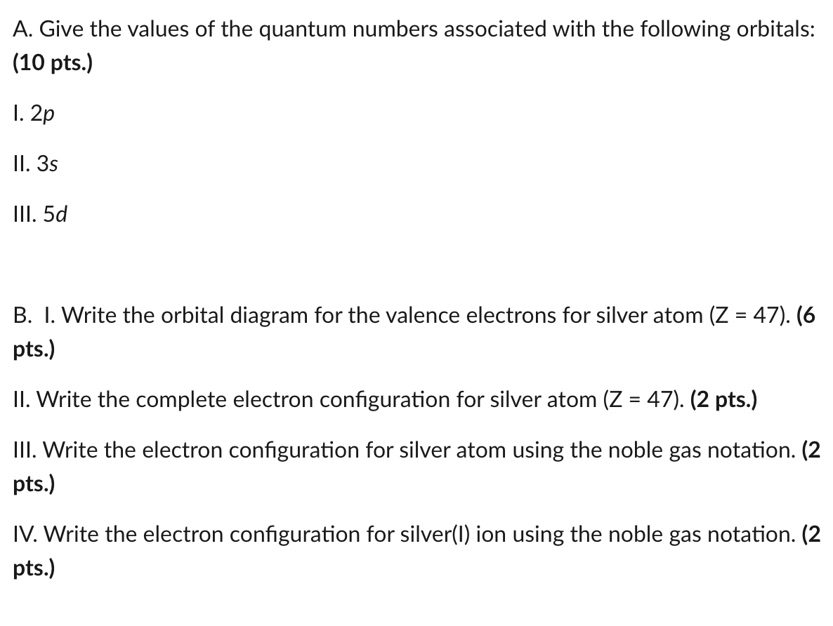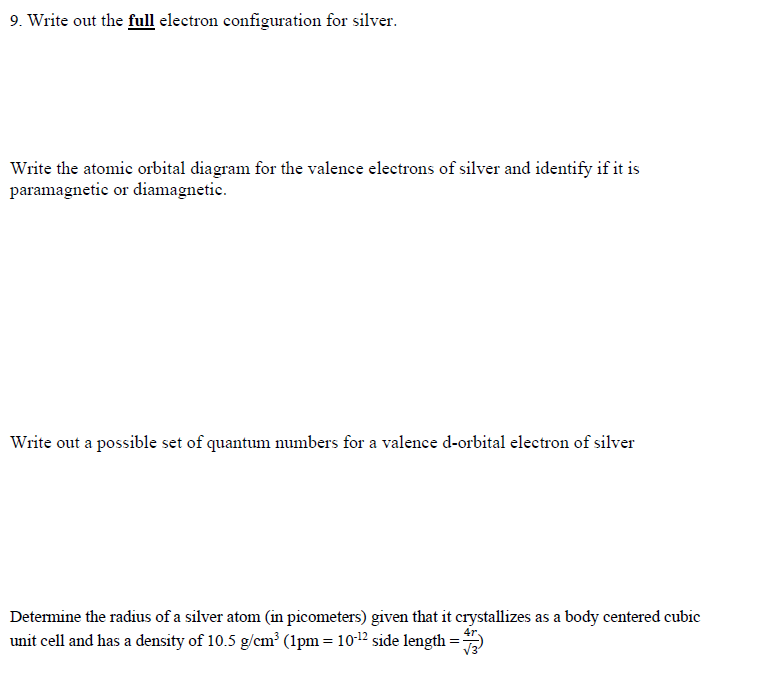 7. (8 pts.) Construct an electron configuration and orbital diagram for the element silver (Ag). For the electron configuration you may use the noble gas shorthand representation if you wish. Question: 7. (8 pts.) Construct an electron configuration and orbital diagram for the element silver (Ag).
