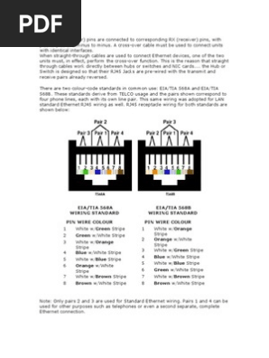 T568A and T568B Wiring Schemes -- What's the Difference? Based on TIA/EIA-568-B.1-2001, the T568A and T568B wiring schemes define the pinout, or order of connections, for wires in eight-pin modular connector plugs and jacks. The only difference between T568A and T568B is that pairs 2 and 3 (orange and green) are swapped. Both configurations wire the pins "straight through", i.e., pins 1 through 8 on ...
