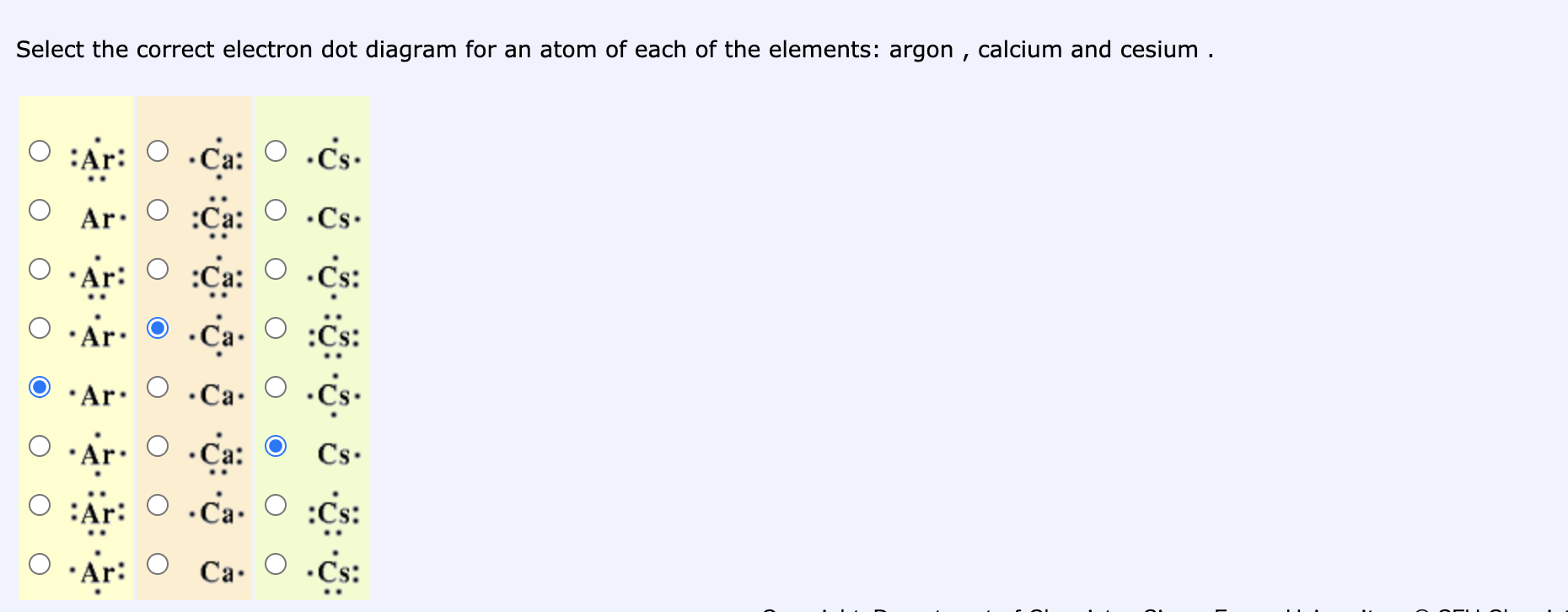 ⚗️How many dots should be placed around argon in a dot diagram? A) 2 C ... The number of dots that should be placed around argon in a dot diagram is : ( D ) 8 . Argon is a noble gas (inert gas) just like helium and neon and they have their outer most shell completely filled with its electrons (8 valence electrons ), which makes them non-reactive with any other element or compound.. Every valence electron in the Lewis structure of an atom is represented with a dot ...